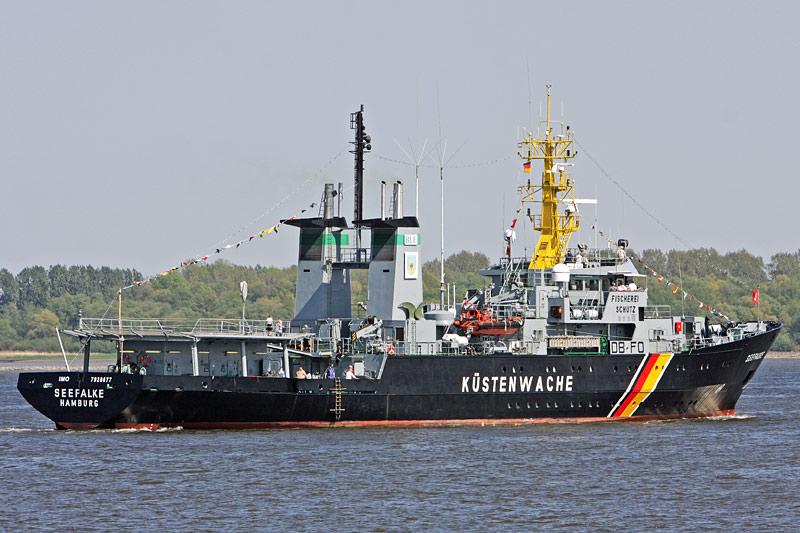 on the occasion of the Hamburg harbour birthday 2008, the german fishery guard vessel >Seefalke<, is on the way to join the entering parade