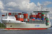type ship of a series of identically constructed feeder container ships of Sietas type 168V (6 vessels - German ice class E3, open hatch container ship, lengthened, closed bridge wing, black window frames, 1 welded deck) - 10/2007 lengthened at KG Norderwerft GmbH & Co., Hamburg, Federal Republic of Germany (additional cargo section) and delivered - all other vessels were subsequently lengthened - also see >Elite<, >Alana<, (>Baltic Swan<, >Akacia<), >Elan< and (OOCL Finland<, >Gorky Park<, >Anina<) - also see >OOCL Nevskiy< (standard type 168), >Maersk Flensburg< (type 168a) and >Larissa< (type 168b) |