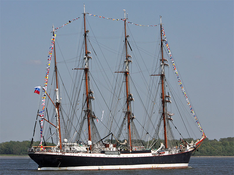 on the occasion of the Hamburg harbour birthday 2008, the 4-mast barque >Sedov< is on the way to join the entering parade
