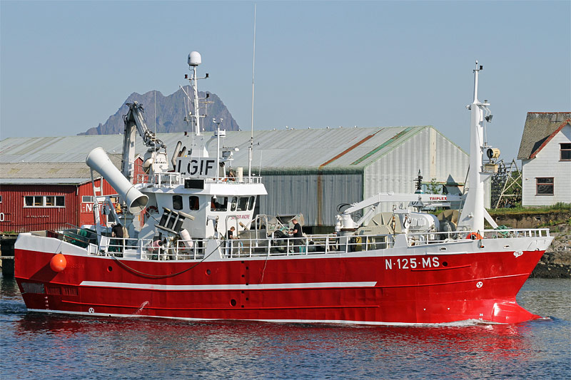 Svolvær, Kveøya, Lofoten (Nordland, N), den Anleger der "AS Lofoten Not & Trål" verlassend