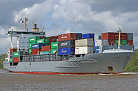 2nd ship of a series of identically constructed feeder container ships of Sietas standard type 168 (26 vessels - German ice class E3, open hatch container ship, closed bridge wing, black window frames, 1 welded deck) - also see >Maersk Flensburg< (type 168a), >Larissa< (type 168b) and >Ida Rambow< (type 168V) - also see >OOCL Neva< |
