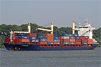 45. Schiff einer Serie nahezu baugleicher Constainerschiffe dieser Werft (46 Einheiten im Design "B170"), siehe auch >CSAV Maresias<, (>Bremen Senator<, >Delmas Suffren<), >CSAV Hong Kong<, >Dorothea Rickmers<, >German Senator<, >Amanda<, >CMA CGM Volga< und (>FESCO Vladimir<, >Vladimir<) - ausgestattet mit 3 Kranen á 45 ts Tragfähigkeit - siehe auch >CMA CGM Neva< |
