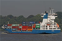 Typschiff einer Serie baugleicher Feeder-Containerschiffe vom Sietas Typ 172 (8 Einheiten - deutsche Eisklasse E3, geschlossene Nock, schwarze Fensterrahmen, 1 geschweißtes Deck), siehe auch >Gotland<, (>Helgaland<, >Page Akia<, >Helga<), >Öland<, (>Tavastland<, >Francop<), (>Götaland<, >Lisa<) und (>Aura<, >Fenja<) - nach Betreiberwechsel |