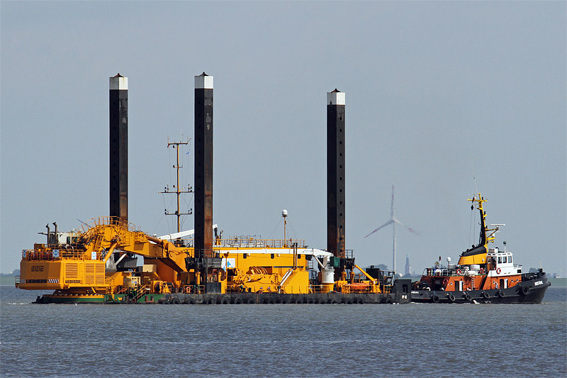 von links nach rechts: Schleppverband, bestehend aus Baggerponton