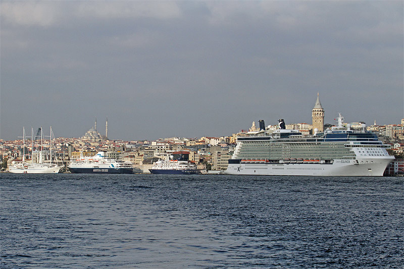 in Istanbul (Türkei), Galatasaray, bei Karaköy am Pier für Kreuzfahrtschiffe liegend