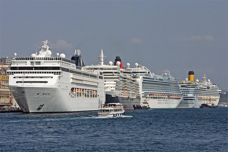| Bemerkung | Blick hinüber nach Karaköy zum Pier für Kreuzfahrtschiffe. Von links nach rechts sind unter anderen zu sehen: Kreuzfahrtschiff MSC Opera, Fähre Turyol 4, Kreuzfahrtschiffe Queen Elizabeth und Ruby Princess, sowie im Hintergrund Kreuzfahrtschiff Costa Favolosa mit Bunkertanker Bogazici 15 und Abfallbeseitigungsschiff Gülsenim längsseits. |