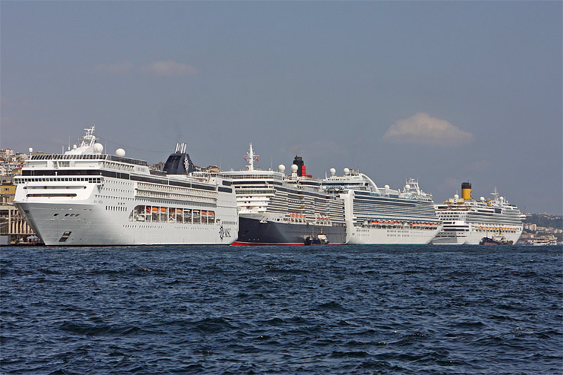 | Bemerkung | Blick hinüber nach Karaköy zum Pier für Kreuzfahrtschiffe. Von links nach rechts sind unter anderen zu sehen: Kreuzfahrtschiffe MSC Opera, Queen Elizabeth, Ruby Princess, sowie Kreuzfahrtschiff Costa Favolosa mit Bunkertanker Bogazici 15 und Abfallbeseitigungsschiff Gülsenim längsseits. Ganz rechts ist außerdem noch die Fähre Turyol 4 zu erkennen |