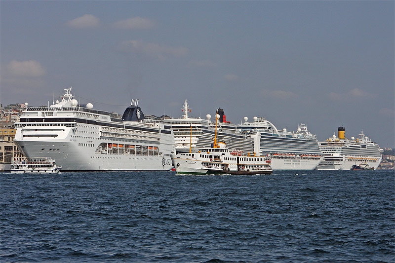 | Bemerkung | Blick hinüber nach Karaköy zum Pier für Kreuzfahrtschiffe. Von links nach rechts sind unter anderen zu sehen: Fähre Turyol 2, Kreuzfahrtschiffe MSC Opera und Queen Elizabeth, Fähre Aydin Güler, Kreuzfahrtschiff Ruby Princess, sowie im Hintergrund Kreuzfahrtschiff Costa Favolosa mit Bunkertanker Bogazici 15 und Abfallbeseitigungsschiff Gülsenim längsseits. |