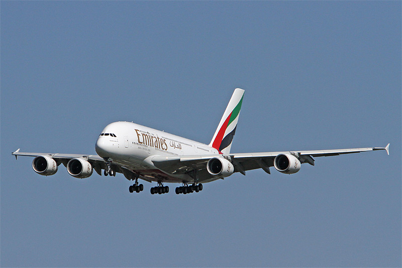 an "Airbus A380" of the airline "Emirates" during the approach for landing after a test flight