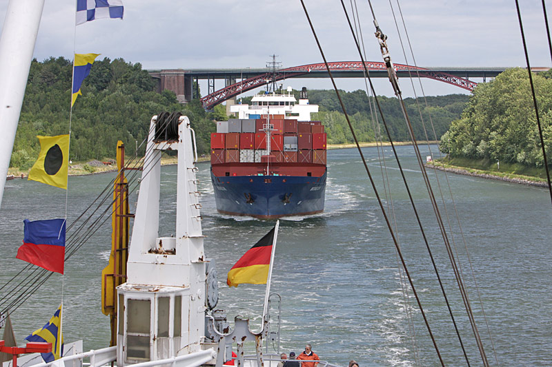 Nord-Ostsee-Kanal, alte und neue Levensauer Hochbrücke, Fahrtrichtung Brunsbüttel