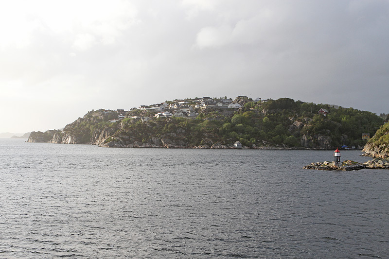 Blick auf die Bucht "Hjelteskjærsvika" mit dem Ort "Straumen" dahinter, rechts ist ein Quermarkenfeuer auf einer kleinen vorgelagerten Insel zu sehen