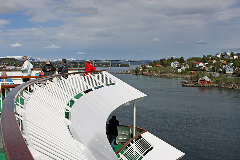 kurz vor dem Ablegen um 11:45, Blick nach Norden auf die Häuser an der "Nordre Harevika" und die "Gisundbrua" im Hintergrund