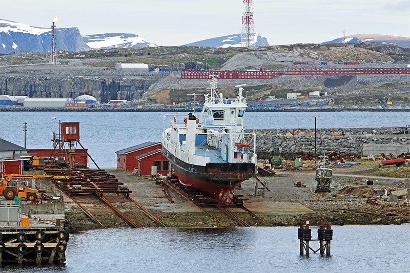 | Bemerkung | Blick nach Norden auf die Werft nahe der "Meridiangata" mit der Fähre Akkarfjord. Im Hintergrund ist ein Teil der Insel "Melkøya" zu sehen. Auf dieser Insel befindet sich die größte Erdgasverflüssigungsanlage (LNG) Europas. Das Foto zeigt hier die Wohngebäude. |