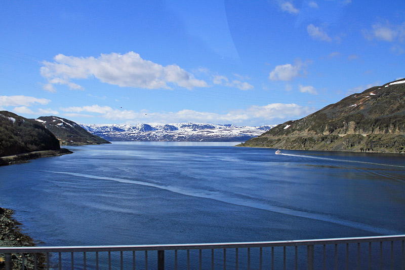 während der Überfahrt zur Insel "Kvaløya" Blick von der Brücke der Hauptstraße 94 westwärts Richtung "Straumen" und der Insel "Seiland" im Hintergrund