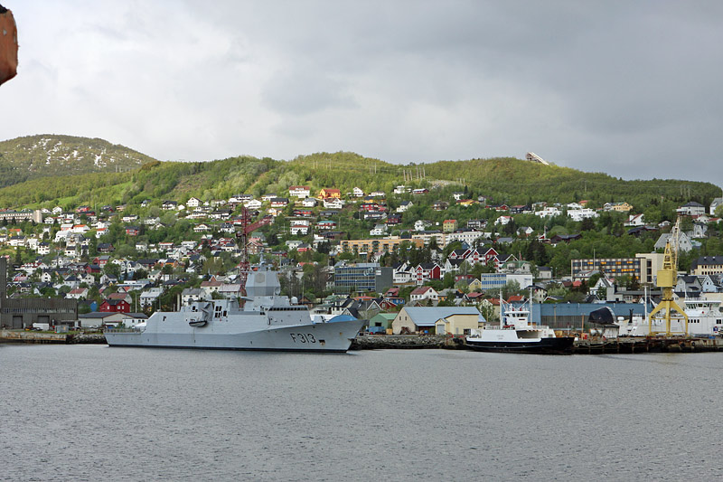 Blick auf den Bereich der Werft "Harstad Mekaniske Verksted AS" mit der Fregatte