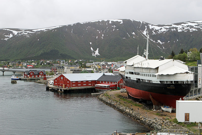 | Bemerkung | 15:20, Abfahrt von "Stokmarknes". Blick nach Süden entlang das Hafenbereichs an der "Havnegata" mit dem Museumschiff "Finnmarken" rechts. Inzwischen hat der Regen "Stokmarknes" erreicht |