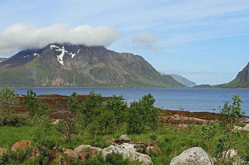 | Bemerkung | Blick nach Westen über den Sund "Lyngværet" zum östlichsten Punkt der Insel "Vestvogøya" mit dem 585 m hohen "Varden". Rechts ist die nächste Brücke der E 10 zu sehen, die "Gimsøya" mit "Vestvogøya" verbindet. |
