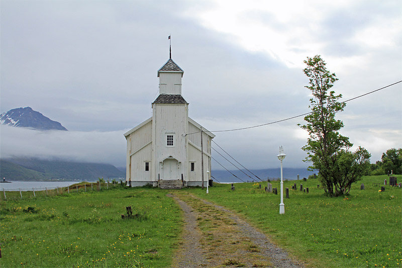 "Gimsøy's" Holzkirche von 1876 am "Gimsøystraumen" gelegen