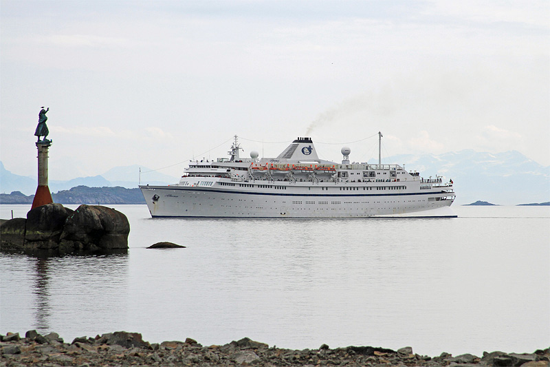 ist gerade eingetroffen und geht außerhalb des Hafens von "Svolvær" vor Anker. Ganz im Hintergrund ist schwach das norwegische Festland zu erkennen.