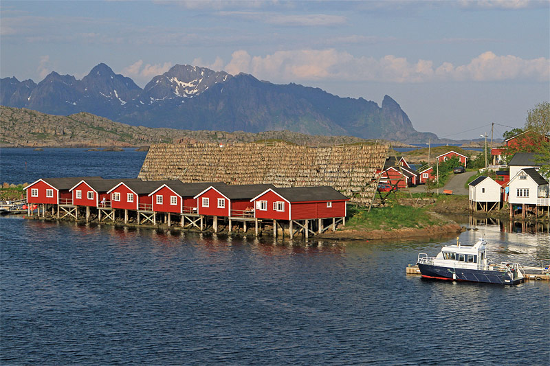 Blick von der Brücke "Bukkedauen" nach Osten zur Insel "Austerøya" auf diverse Hütten von "Svinøya Rorbuer". Im Hintergrund ist die bis zu 750 m hohe Insel "Stormolla" zu sehen.