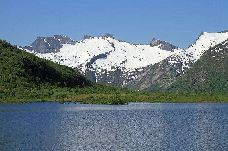 Blick nach Westen über den südlichen Teil des "Kongsvatnet" mit der kleinen Insel "Øya" zum Massiv des 731 m hohen "Stortinden"