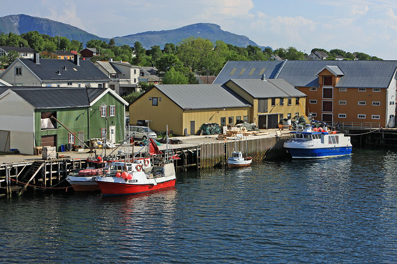 Blick auf die Kaianlage am "Strandveien", Höhe "E. Olsens Gate". Rechts liegt das Fischereifahrzeug