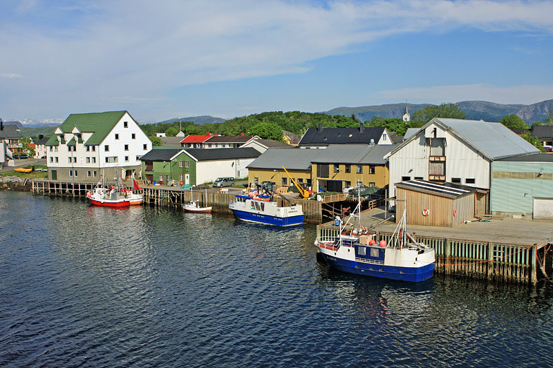 Blick zurück auf die Kaianlage am "Strandveien", Höhe "E. Olsens Gate". Zu sehen sind neben anderen die Fischereifahrzeuge