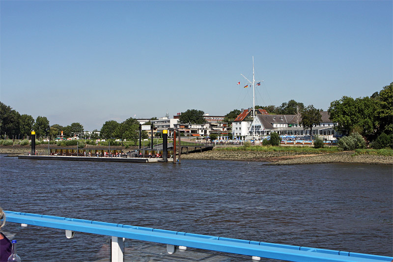 Blick auf "Schulau - Willkommhöft", mit dem Fähranleger "Willkommhöft" und dem "Schulauer Fährhaus". Der Name "Willkommhöft" steht für die berühmte Schiffsbegrüßungsanlage, die am 12. Juni 1952 zünftig mit einer Buddel Rum getauft und in Betrieb genommen wurde. Das "Schulauer Fährhaus" hat eine längere Geschichte. Bereits um 1850 stand hier auf einem kleinen Hügel J. H. Heinsohn´s Etablissement "Zum Parnass" mit einer großzügigen Terrasse mit Elbblick. Das heutige Gebäude wurde 1864 als Bauernhaus gebaut. 1875 wurde die Kruggerechtigkeit "Fährhaus zur schönen Elbaussicht" verliehen. |