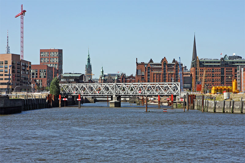 Blick in den "Magdeburger Hafen", der heute nicht mehr als Hafen genutzt wird. Auch hier sieht man die Bautätigkeit in der "HafenCity". Über der Brücke der "Überseeallee" ist der grüne Turm des Rathauses zu sehen. Daneben, etwas niedriger, kann man das Verwaltungsgebäude der HHLA erkennen (grüne Türmchen). Weiter rechts, immer noch oberhalb der Brücke, das hohe rote Gebäude ist der ehemalige "Kaispeicher B" und beherbergt seit 2008 das "Internationale Maritime Museum Hamburg". Der Kirchturm rechts daneben gehört zur "St. Petri-Kirche". |
