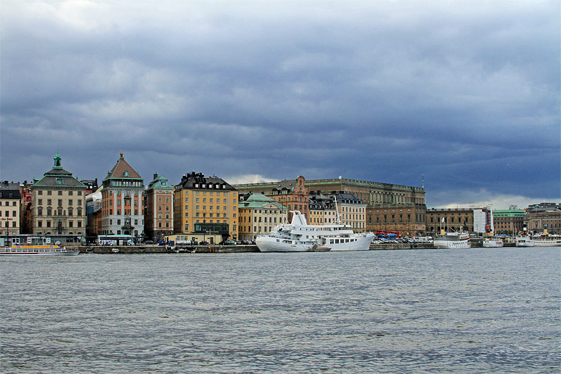 | Bemerkung | Blick nach Nordwesten auf den nördlichen Bereich von "Skeppsbrokajen" auf Gamla Stan. Am Kai liegt ein Theaterschiff sowie einige alte Fahrgastschiffe, wobei es sich bei dem linken um Riddarholmen handelt. Das monumentale Gebäude rechts im Hintergrund ist der "Königliche Palast" von Stockholm, der sich ebenfalls auf Gamla Stan befindet. |
