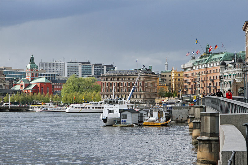 | Bemerkung | Blick nach Nordwesten entlang der Brücke und der Gebäudekulisse an der Straße "Södra Blasieholmskajen". Das imposante Gebäude mit den Flaggen, direkt oberhalb der Brücke, beherbergt das "Grand Hotel Stockholm". Die rote Kirche links ist die "St. Jacobs-Kirche", die gleich westlich der hübschen Parkanlage "Kungsträdgården" liegt. |