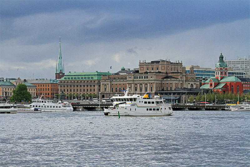 | Bemerkung | von der gleichen Position geht der Blick etwas mehr nach Westen. Rechts ist wieder die "St. Jacobs-Kirche" zu sehen. Gleich links daneben erkennt man das Gebäude der "Königlichen Oper (Kungliga Operan)", vor der gerade die Fähre Nämdö vorbeizieht. Links im Hintergrund ist außerdem noch der Turm der "Klarakirche" zu erkennen. |