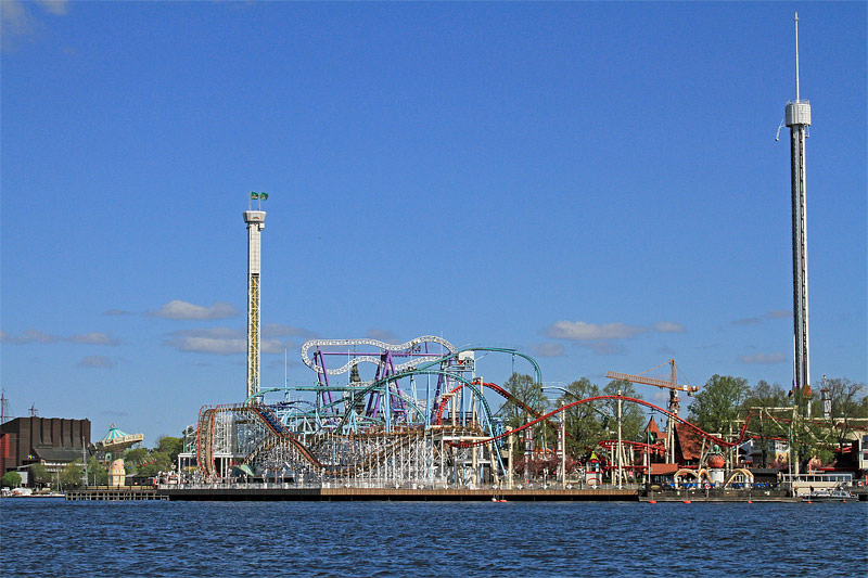 Blick nach Nordosten auf den Vergnügungspark "Gröna Lund Tivoli" auf der Insel Djurgården. Ganz links im Hintergrund ist noch einmal das Gebäude des "Vasa-Museums" zu sehen.