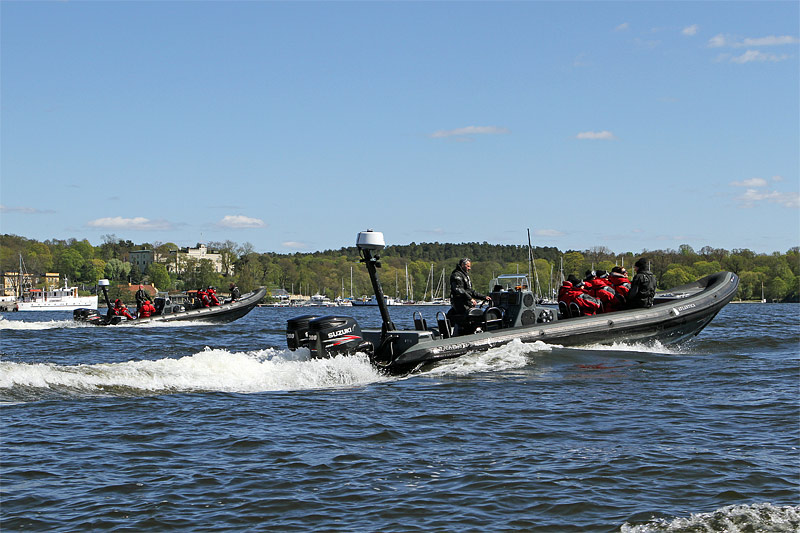 Stockholm Sightseeing einmal anders: zwei Speedboote überholen uns auf dem Weg in die Schären. Im Hintergrund ist die "Grüne Lunge" von Djurgården zu sehen.