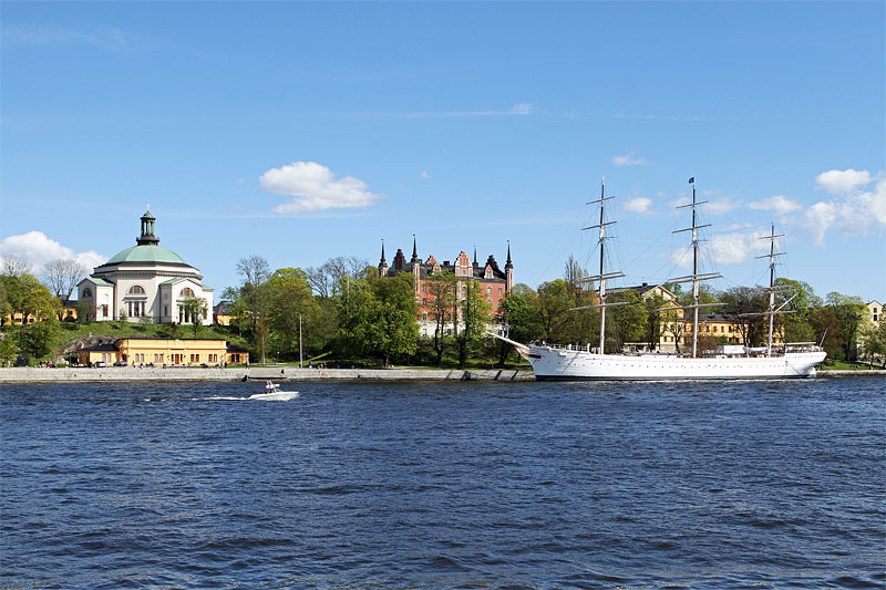 Blick nach Südosten zur Insel Skeppsholmen auf den Uferbereich an der Straße "Västra Brobänken". Am Ufer liegt das Segelschiff
