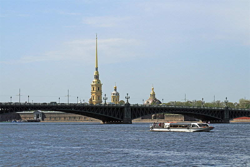Blick nach Westen auf die Dreifaltigkeitsbrücke "Troitskiy Most". Im Hintergrund ist der Turm der "Peter und Paul-Kathedrale" zu sehen.
