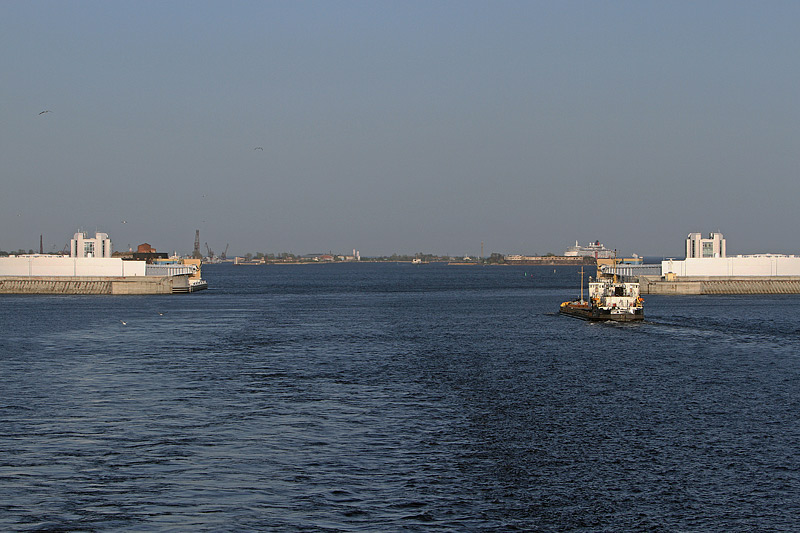 eine letzte Nahaufnahme des Sturmflutwehres von "Kotlin" mit dem Kreuzfahrtschiff