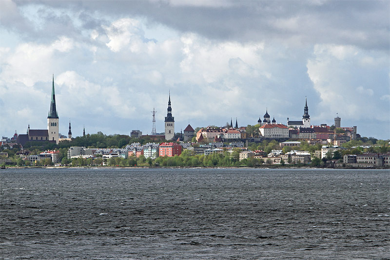 Blick nach Südosten auf die Umgebung der Altstadt von "Tallinn". Die Türme gehören zu folgenden Gebäuden (von links nach rechts): Olaikirche "Oleviste kirik", altes Tallinner Rathaus ("Raekoda", im Hintergrund), Heiliggeistkirche "Püha Vaimu kirik" (im Hintergrund hinter den Bäumen), Nikolaikirche "Niguliste kirik", Doppelturm der Karlskirche "Kaarli kirik", Alexander-Newski-Kathedrale "Aleksander Nevski katedraal", Domkirche "Toomkirik" und der "Lange Hermann" ("Pikk Hermann", höchster Turm der Stadtmauer und Bestandteil des Tallinner Schlosses) |