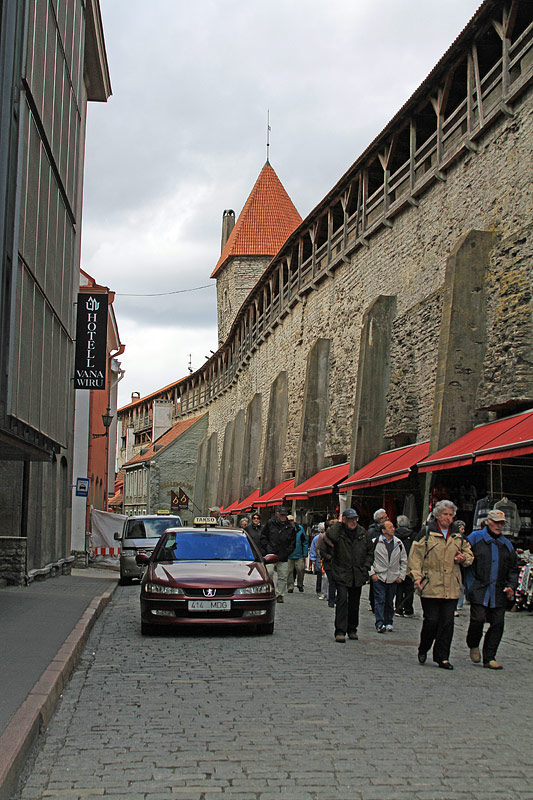 Blick nach Norden in die Straße "Müürivahe" hinein. Hier ist ein schöner Teil der Stadtmauer mit dem Hellemann-Turm "Hellemani torn" aus dem frühen 15. Jahrhundert zu sehen.