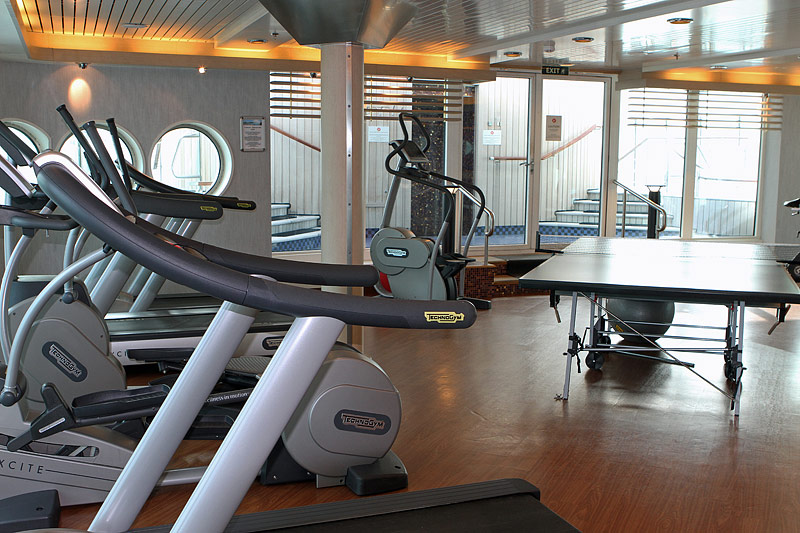 Fitnessraum von der Steuerbordseite aus gesehen. Blick Richtung Außentür zum Whirlpoolbereich.
