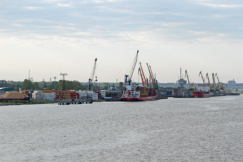 | Bemerkung | Blick von der gleichen Postition etwas mehr in südlicher Richtung auf die Hafenanlagen nördlich der "Sarkandaugava"-Mündung. Bei den beiden Schiffen handelt es sich um das Feeder-Containerschiff Containerships VI und den Chemikalientanker Falcon. |