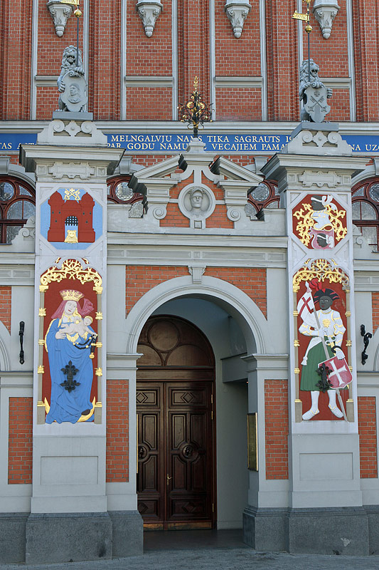 Blick auf das Eingangsportal des Schwarzhäupterhauses "Melngalvju nams". Rechts ist der Schutzpatron der Bruderschaft, der "Heiligen Mauritius" dargestellt.