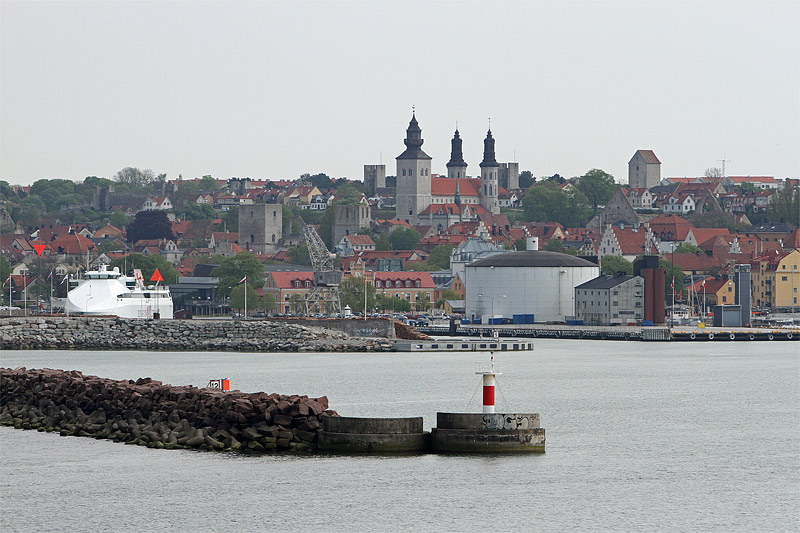 | Bemerkung | wir erreichen die nächste Hansestadt: "Visby", ebenfalls von einer mittelalterlichen Stadtmauer umgeben. Nach einem abziehenden Gewitter ist der Himmel noch grau. Das Foto zeigt den Blick nach Nordosten auf einen Teil der Altstadt mit dem Dom St. Maria "Visby S:ta Maria domkyrka". Links ist außerdem die Schnellfähre Gotlandia zu sehen, die im nördlichsten Hafenbecken liegt. |