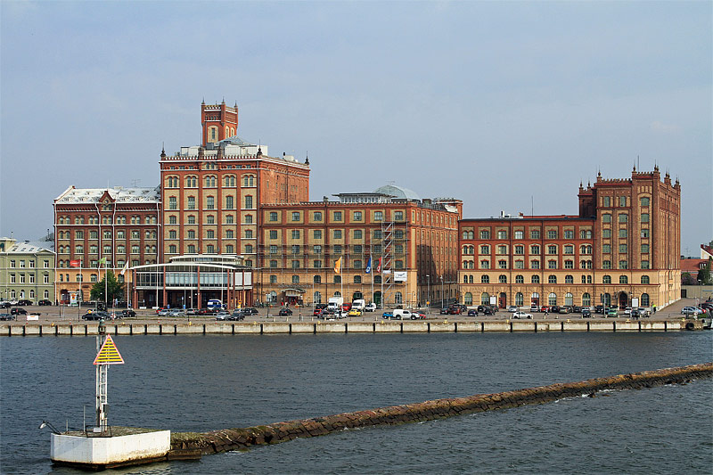 Blick nach Nordwesten über die Hafenmole hinweg auf den Gebäudekomplex des regionalen Kalmarer Museums "Kalmar läns museum"