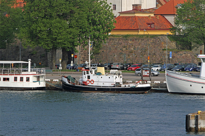 Blick nach Westen auf den Uferbereich an der Straße "Skeppsbrogatan" mit dem Schlepper