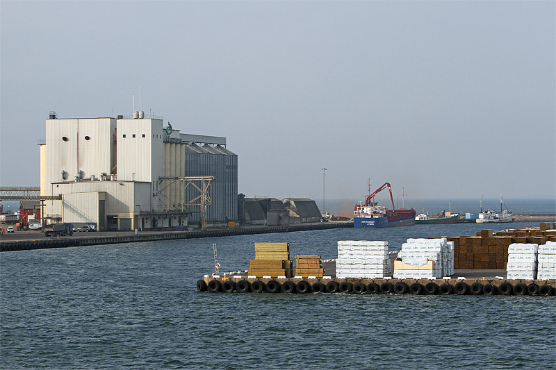 Blick nach Süden in das östlichste Hafenbecken. Am östlichen Kai liegt der Frachter