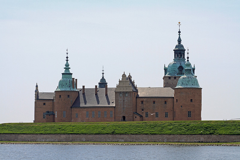 Nahaufnahme des Schlosses. Das Kalmarer Schloss "Kalmar Slott" ist der am besten erhaltene Renaissance-Palast in Nordeuropa und spielte durch seine Lage an der einstigen Grenze zu Dänemark ein wichtige Rolle in der schwedischen Geschichte. 1180 wurde ein erster Verteidigungsturm errichtet, Ende des 13. Jahrhunderts wurde dieser zusätzlich um eine Ringmauer mit vier Rundtürmen erweitert und damit zur Festungsanlage ausgebaut. Die Festung wurde in den vergangenen 395 Jahre 22 Mal belagert, konnte aber nie erstürmt werden. |