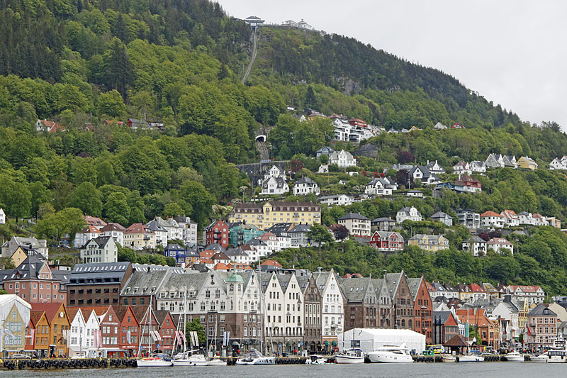 Blick vom "Tollbodkaien - Süd" zu "Bryggen" und zum "Fløyen" mit der "Fløibahn"