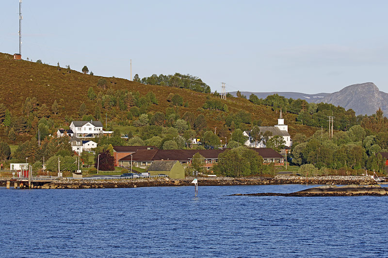 Blick von der gleichen Position nach Südwesten zum Festland bei "Åram" mit dem Fähranleger (links) und der Kirche im Hintergrund