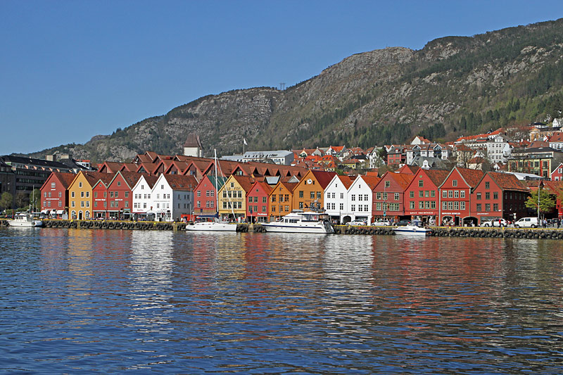 Blick vom südöstlichen Ende des "Strandkaien" nach Norden auf den kompletten alten Teil von "Bryggen" (Hanseviertel) mit seinen Holzhäusern